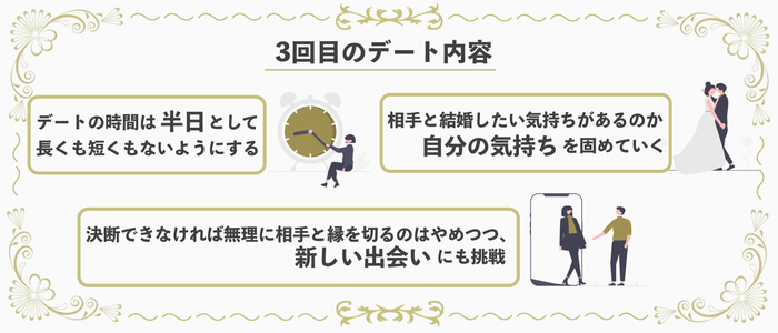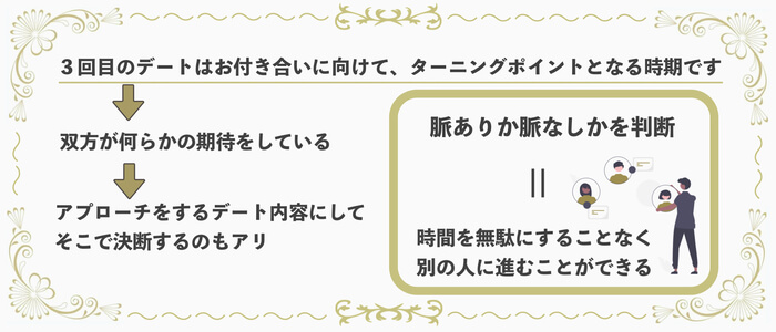 そういった意味で3回目は相手の人となりを知るには十分な回数であり、そろそろこのまま続けるか、お断りするかを考えるべき時期だとも言えます。