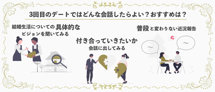 3回目のデートともなると、だんだんと打ち解けていき、お相手とも話しやすくなっている頃ですよね。