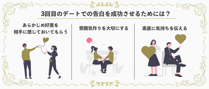 3回目のデートでの告白を成功させるために、意識するべきポイントをお教えいたします。
