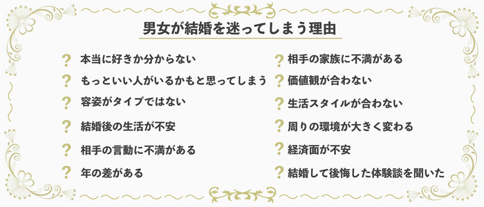 男女が結婚を迷ってしまう理由として、どのようなものが挙げられるのでしょうか?