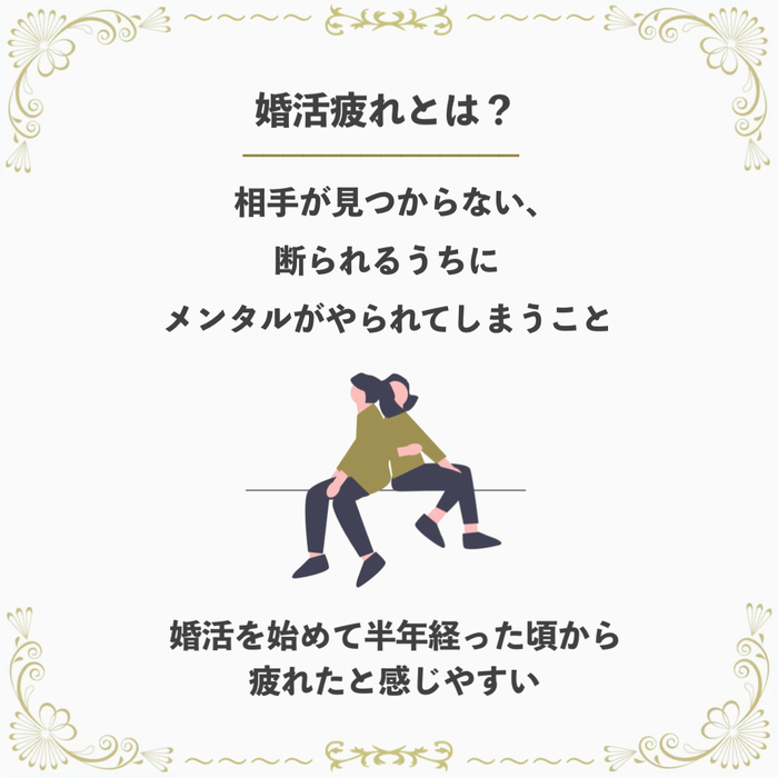 婚活疲れとは、思うように結婚相手が見つからなかったり、お見合いを繰り返しながらも断られたりしていくうちにメンタルがやられてしまうこと。