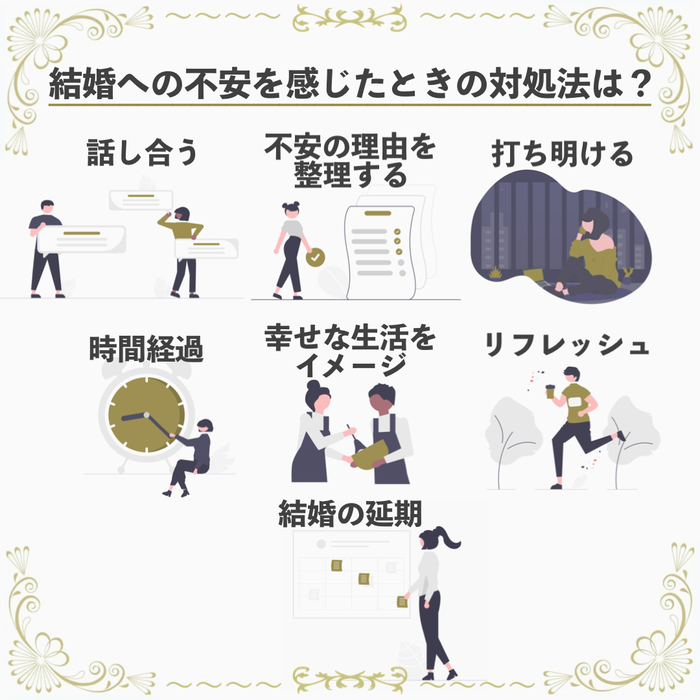 結婚への不安を感じたときの対処法としては、パートナーや友人に不安を打ち明けることが挙げられます。