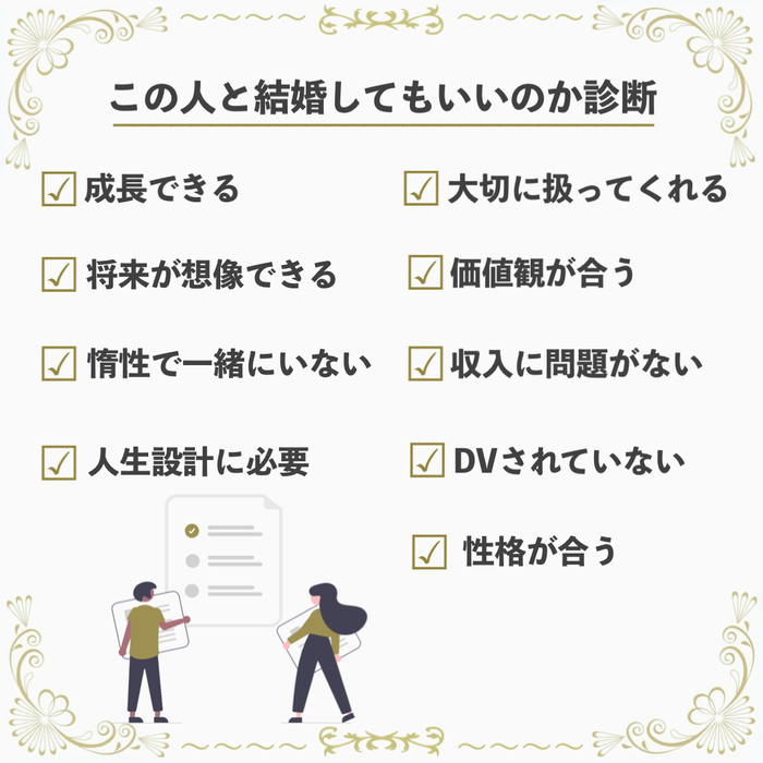 この人と結婚してもいいのかを見極めるポイントは、9つあります。