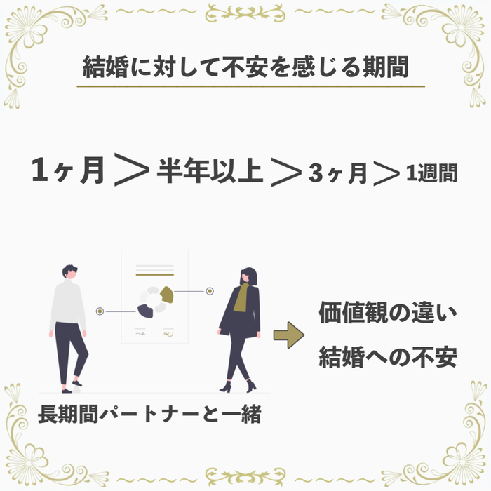 メディア編集スタッフこれは、長期間パートナーと一緒に過ごしたことで価値観の違いなどが感じられるようになり、この人と結婚して上手くやっていけるのか不安に感じるためだと考えられます。