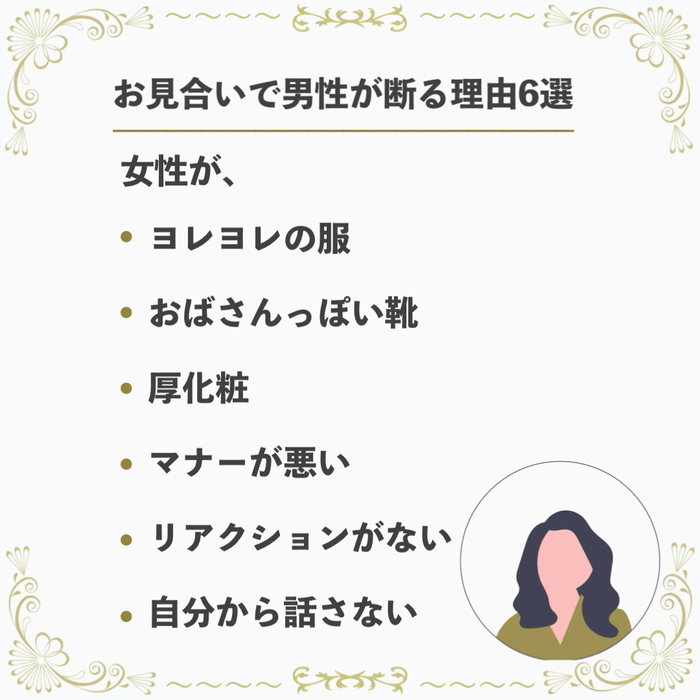 センスがない、おばさんくさいと見られてしまい、お見合いを断られる原因になることもあります。