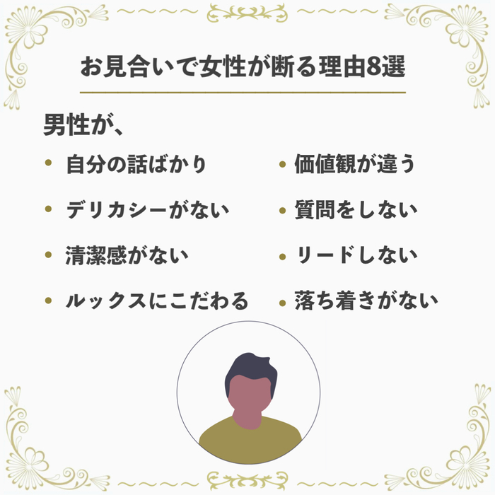 その結果、この人とは付き合えないと判断されてしまい、お見合いで断られることになるのです。