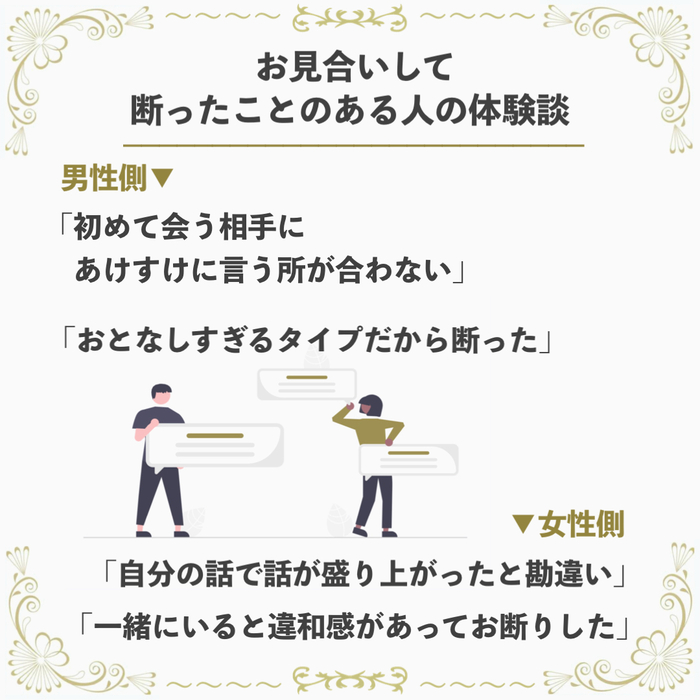 メディア編集スタッフ今回は、男女別のお見合いで断られる理由について解説します。