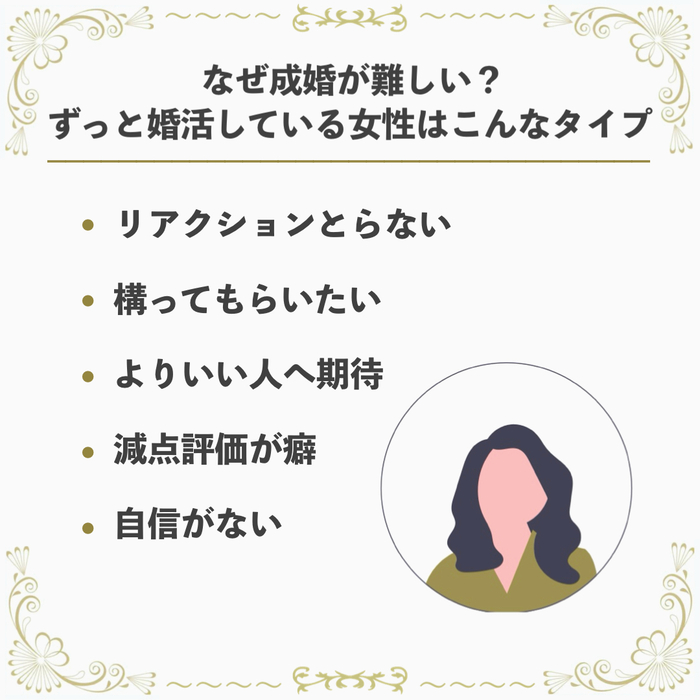 - なぜ成婚が難しい?ずっと婚活している女性はこんなタイプ