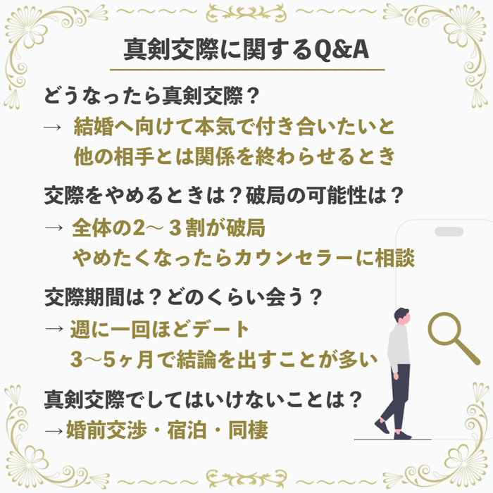 しかし、「真剣交際って具体的に何をすればいいの?」「期間はどれくらい?」「やってはいけないことってあるの?」といった、疑問や不安をお持ちの方も多いのではないでしょうか?